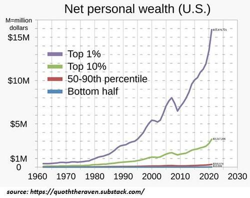 The bottom 50% of American households own a tiny slice of the nation's financial wealth. The vast expansion of central bank stimulus and the resulting asset bubbles haven't increased the wealth of the bottom 170 million Americans, which hovers at 2.6%--signal noise compared to the 31% owned by the top 1% and the 68% owned by the top 10%.