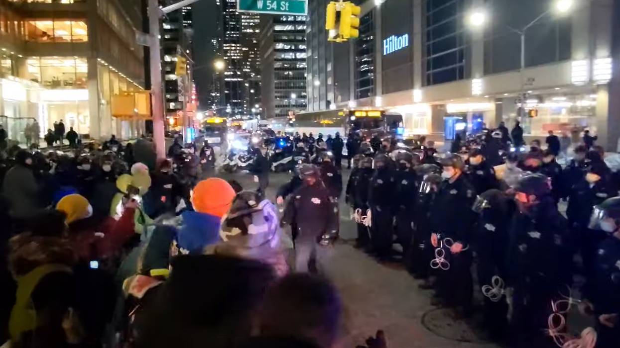 Video taken by Oliya Scootercaster of Freedom News TV shows NYPD officers clashing with protesters in the streets of Manhattan.