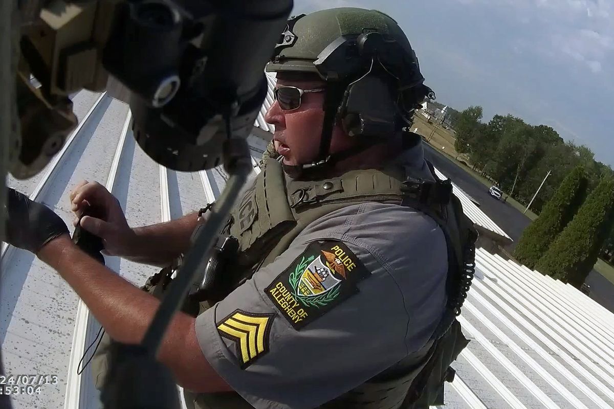 A local police sniper took photos of would-be assassin Thomas Matthew Crooks at a retaining wall of the building he used as a perch to shoot former President Donald J. Trump on July 13.