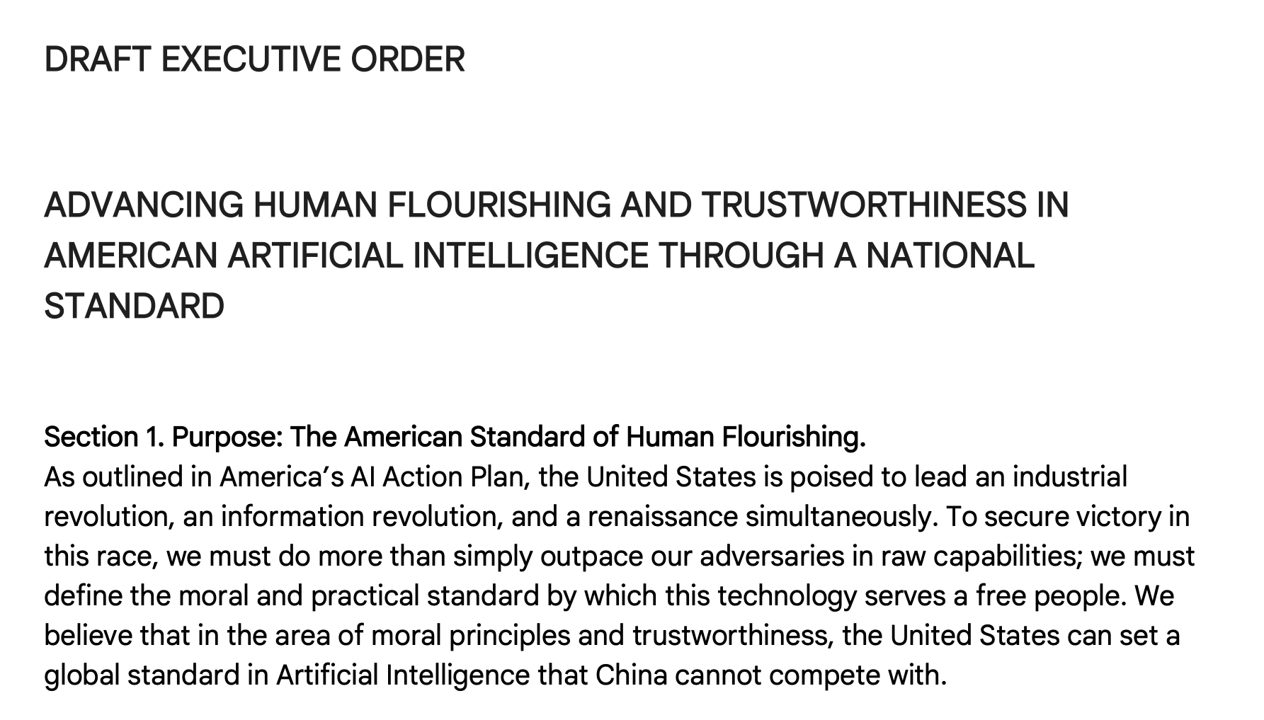 The “National Standard” EO would mitigate social harms, prevent catastrophic risk, hand power over to AI users rather than tech oligarchs, and to “promote human flourishing.” Setting aside questions of how AI and true human flourishing can coexist, the intent is clear—uphold human interests over profits or the Machine.