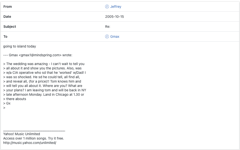 In another instance of intelligence connections put up for sale, an email from Ghislaine Maxwell to Epstein details the efforts of one unnamed man to trade off the CIA’s good name. In the email below, Maxwell claims to have met a CIA “operative” who worked with her father Robert Maxwell, a notorious British media magnate and fraudster who was suspected by the British foreign service of being a spy. That “operative,” a term no CIA officer would use, claimed he “could tell, all find all, and reveal all, (for a price)!!”
