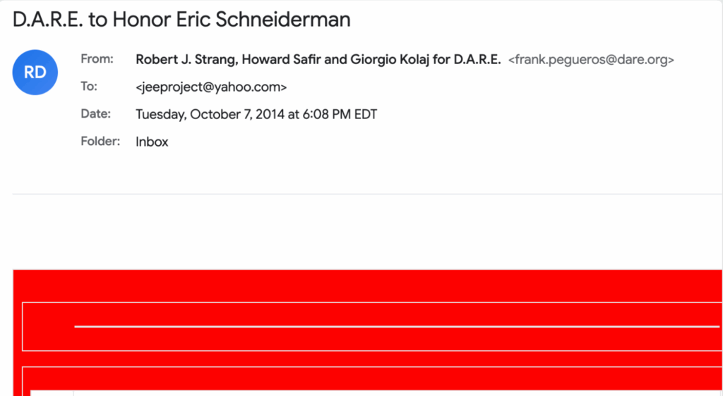 The CBP Explorers were not the only youth organization seeking donations from Epstein. For years after Epstein inked his plea deal, the disgraced financier was routinely invited to attend the D.A.R.E fundraising gala in New York by the chairmen Robert J. Strang (former FBI/DEA), Howard Safir (NYPD/DEA/USMS), and the D.A.R.E President Frank Pegueros.