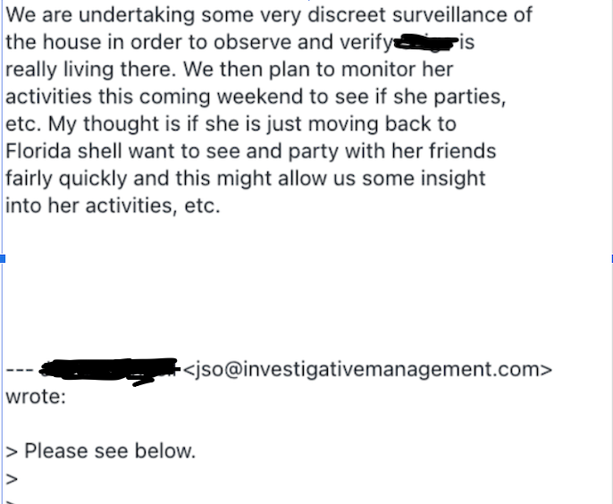 In another email, a private investigator from Investigative Management describes surveillance of a victim to try to obtain proof that she is partying.