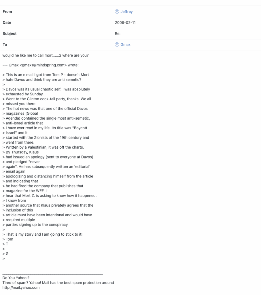 In another illustrative email, Ghislaine Maxwell forwards a complaint from a Davos participant objecting to what they call “the single most anti-Semitic, anti-Israel article” printed in the World Economic Forum’s official magazine at the time, Global Agenda.