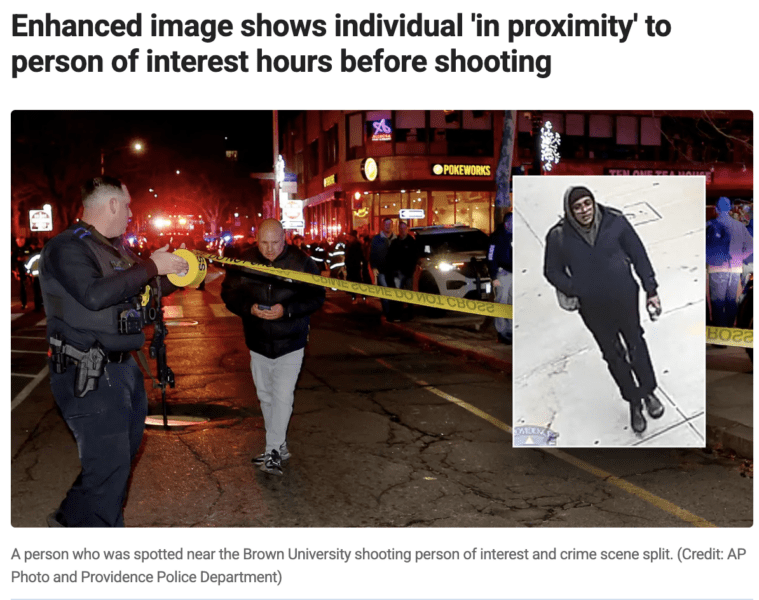 It’s early days, and Americans tend to expect quick results, so it is perhaps unfair to expect an immediate arrest in the horrific case of the Brown University assassin case. Still, by any standard, it’s hard to say that the investigation has inspired confidence. It’s been five days, and nobody involved has covered themselves in glory. Information has been withheld, the FBI jumped the gun on announcing a potential arrest, and many of the witnesses haven’t yet been interviewed. NBC News: Authorities have been combing through the 200 credible tips they have received, he said Tuesday. Complicating the ongoing search is the fact that many students, faculty and staff left campus after the school canceled the remaining week of its fall semester. Authorities shared images this week of the person of interest, which show a man they say is about 5 feet, 8 inches tall and has a stocky build. The FBI, in coordination with Providence police and Rhode Island state police, released a video timeline Tuesday showing the man wearing a dark hat, a two-tone zippered jacket, black pants and a dark medical mask covering most of his face. The timeline of stitched-up security video from the neighborhood surrounding the university campus shows the man walking around the area, about a block away from campus, at 2 p.m. ET — two hours before the shooting Saturday. There is also video of him walking in front of the building where the shooting happened and of him walking away from campus after the shooting. There is no video showing the person of interest entering the Barus and Holley engineering building, where the shooter opened fire. (NBC News)