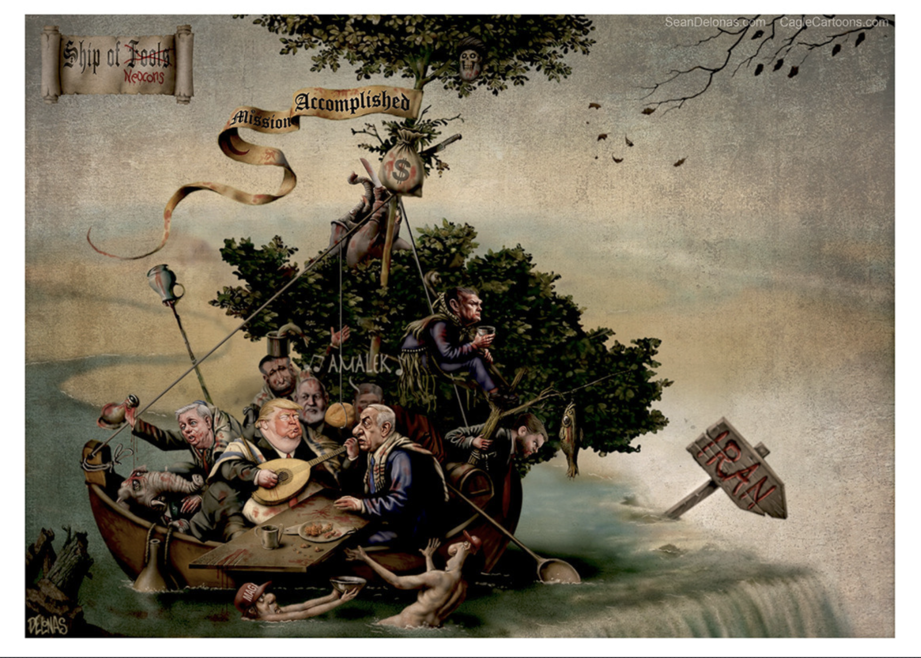 The cartoon, drawn by former New York Post cartoonist Sean Delonas, depicts the lawmakers aboard a rowboat labeled “Ship of Neocons”—a play on the Hieronymus Bosch painting Ship of Fools—that is about to plummet over a waterfall. A bag of blood-smeared money crowns the mast, and the word “Amalek,” a reference to a historical enemy of the Jewish people from the Hebrew Bible, appears in the background.